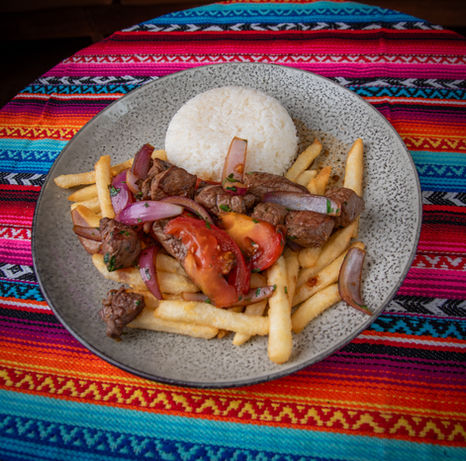 Stir-fried Angus beef strips sautéed with onions, tomatoes, soy sauce, and Peruvian spices. Served over golden fries with a side of jasmine rice.